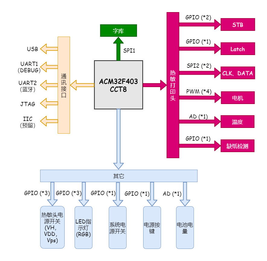 本方案可以通过UART、USB和蓝牙接口接收数据,并通过ACM32F403芯片的Timer,GPIO,ADC、SPI等模块进行热敏打印机头的打印工作。