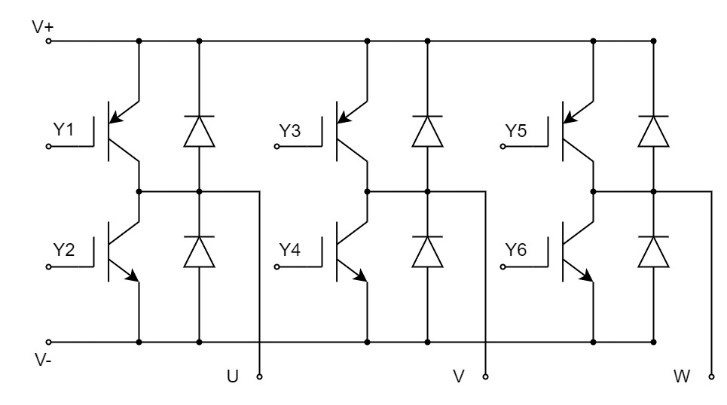 经过整形和滤波之后的直流信号接入到上图的环境V+和V-端,控制电路通过Y1~Y6端口,控制IGBT的开关得到交流电机的三相交流控制信号,以完成对电机的控制。